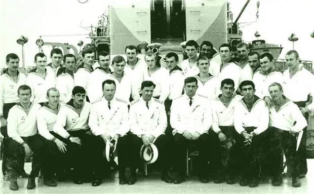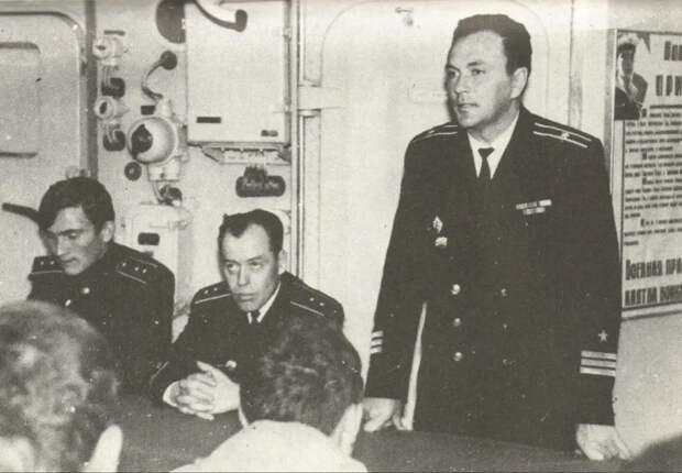 Среди матросов. (слева направо): Замполит В. Саблин, командир Потульный старпом Н. Новожилов. Других офицеров на фото нет